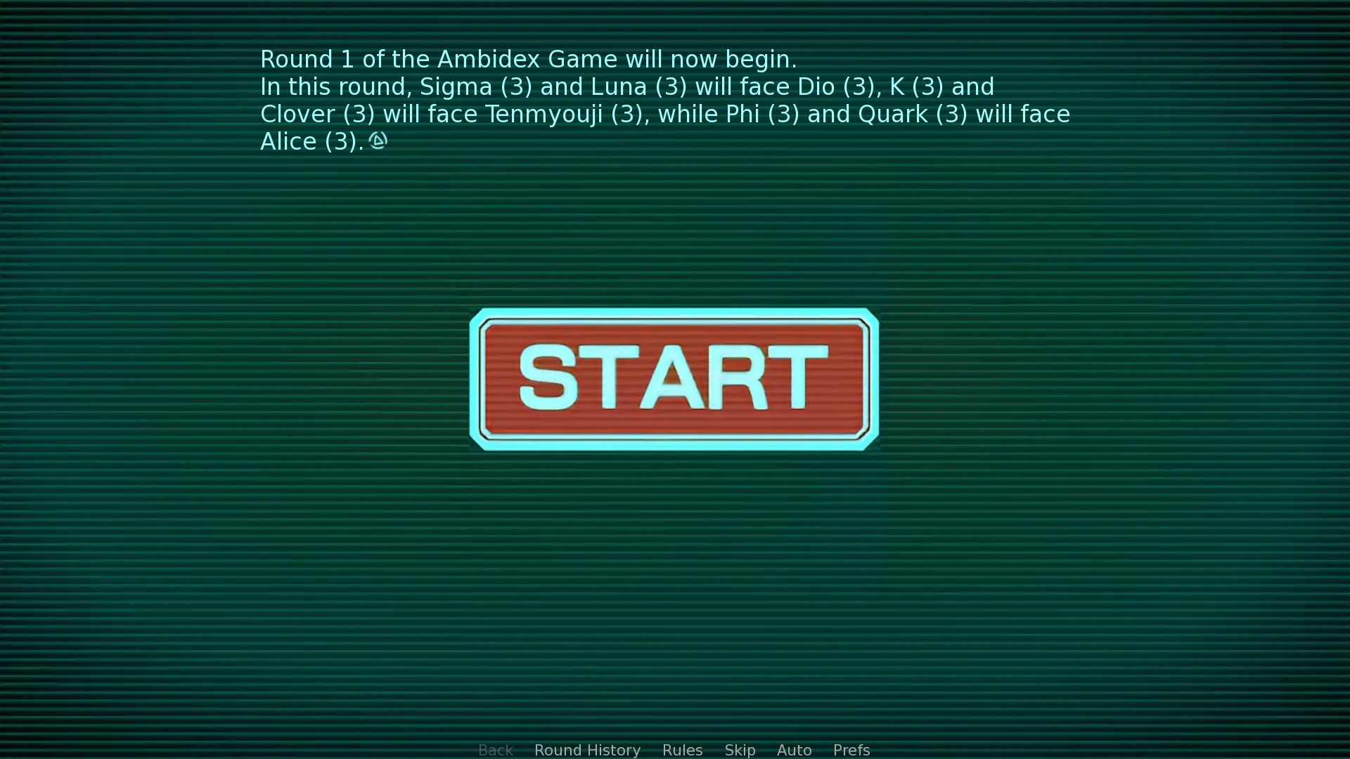 In this simulation, you can watch nine players play the Ambidex Game, or jump in yourself to play against familiar characters from the whole series. Want to see a match between Seven and K? Carlos and Santa? Alice and Mira? This is your chance!