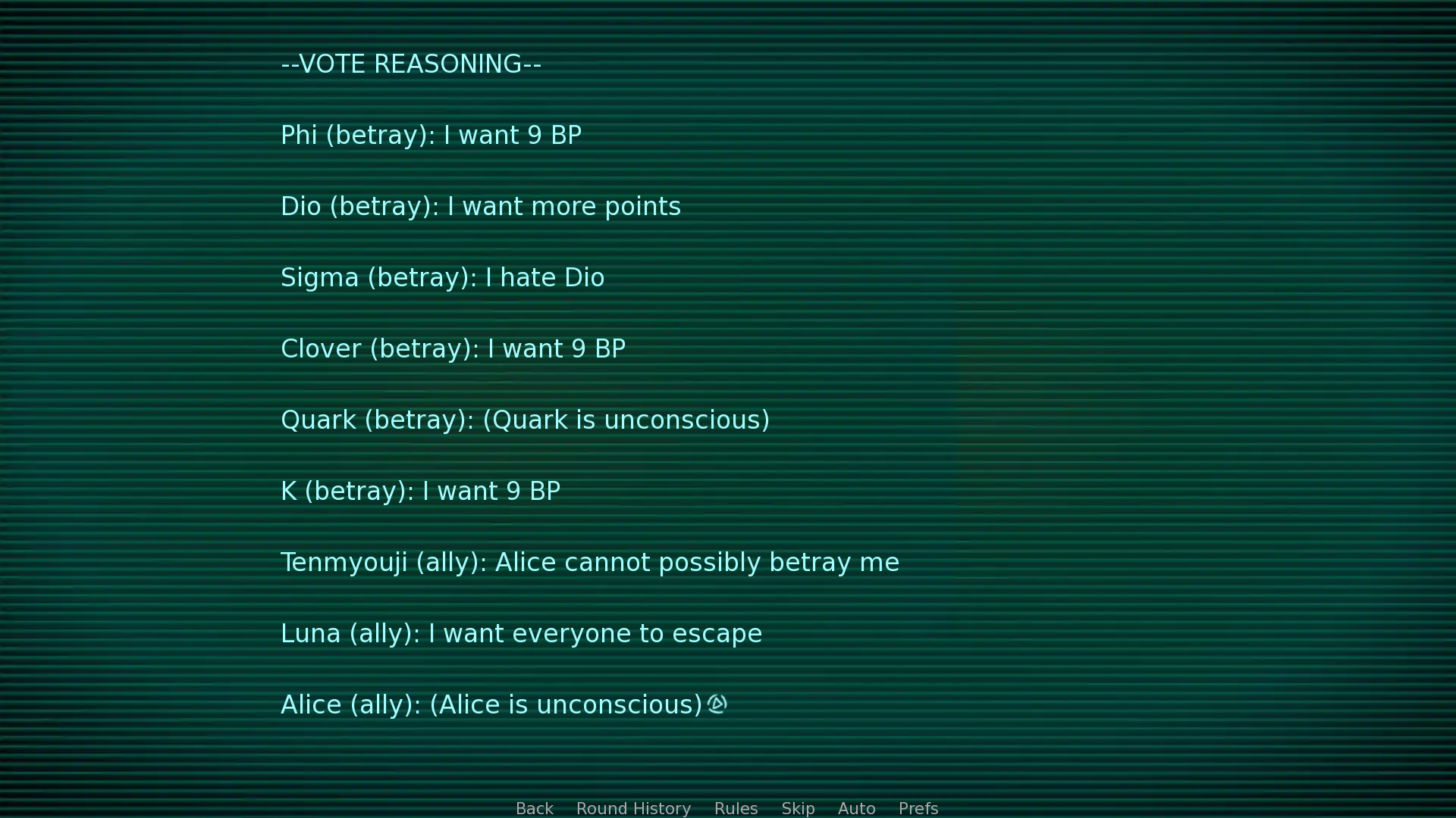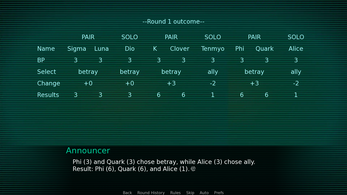 I love the game so far! Would love a pair/solo mode though. And also, I feel like the reasons for voting don't exactly make sense yet. Many participants now vote betray at someone who isn't untrustworthy, purely because they have 7 BP, while they themselves have 7 BP too. And I feel like some of the personal bonds between characters also kinda get disregarded when it comes to reasoning. For example, Phi and K having this 'bond' they talk about. Or Clover and Tenmyouji/Junpei trusting each other